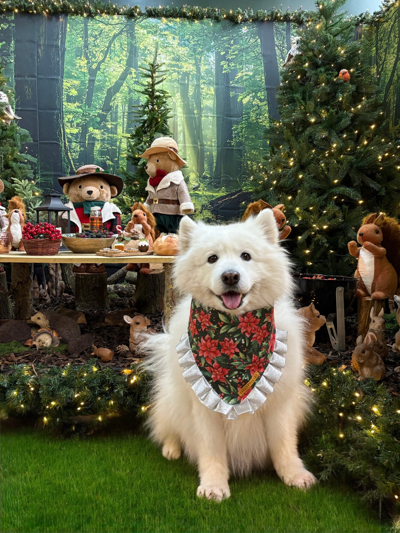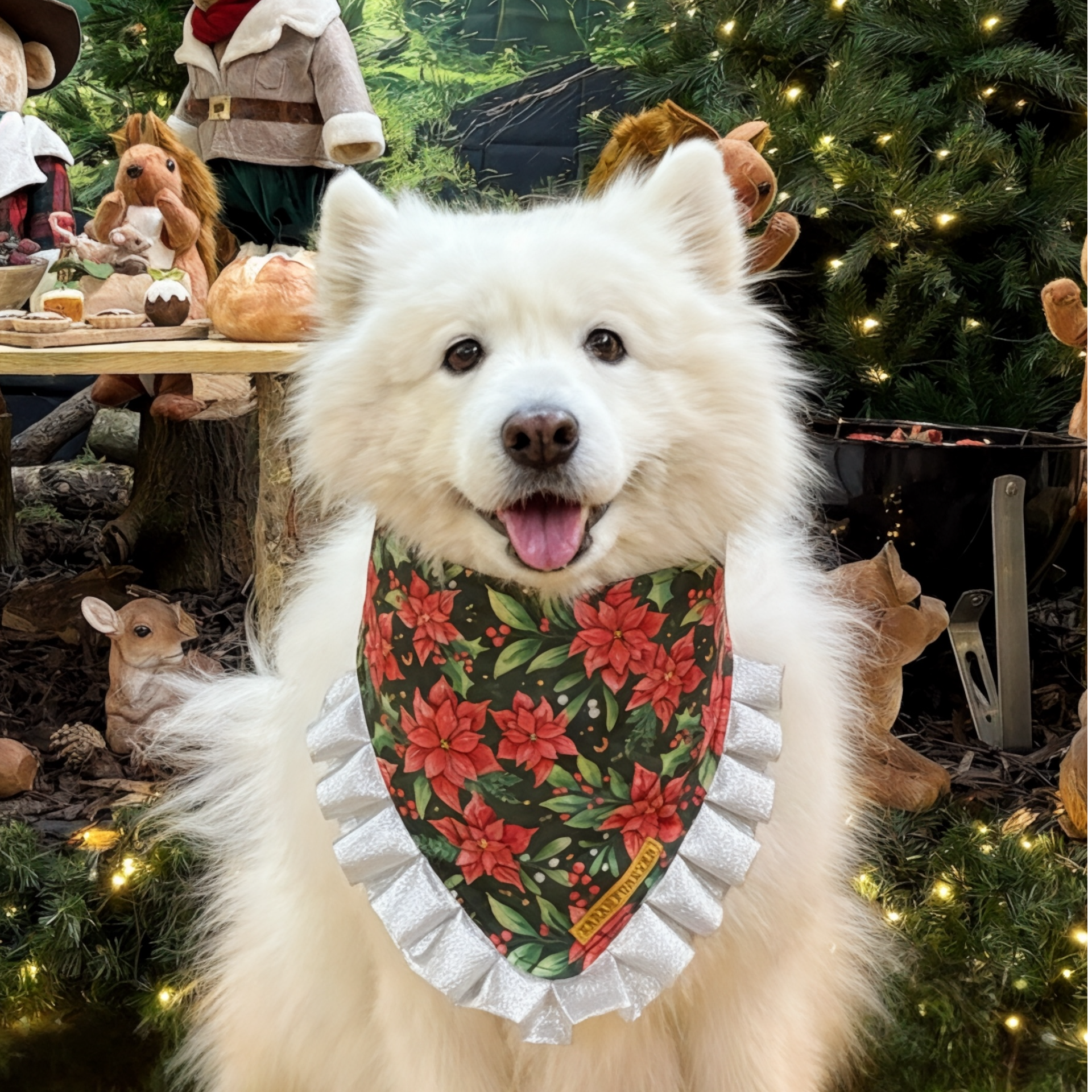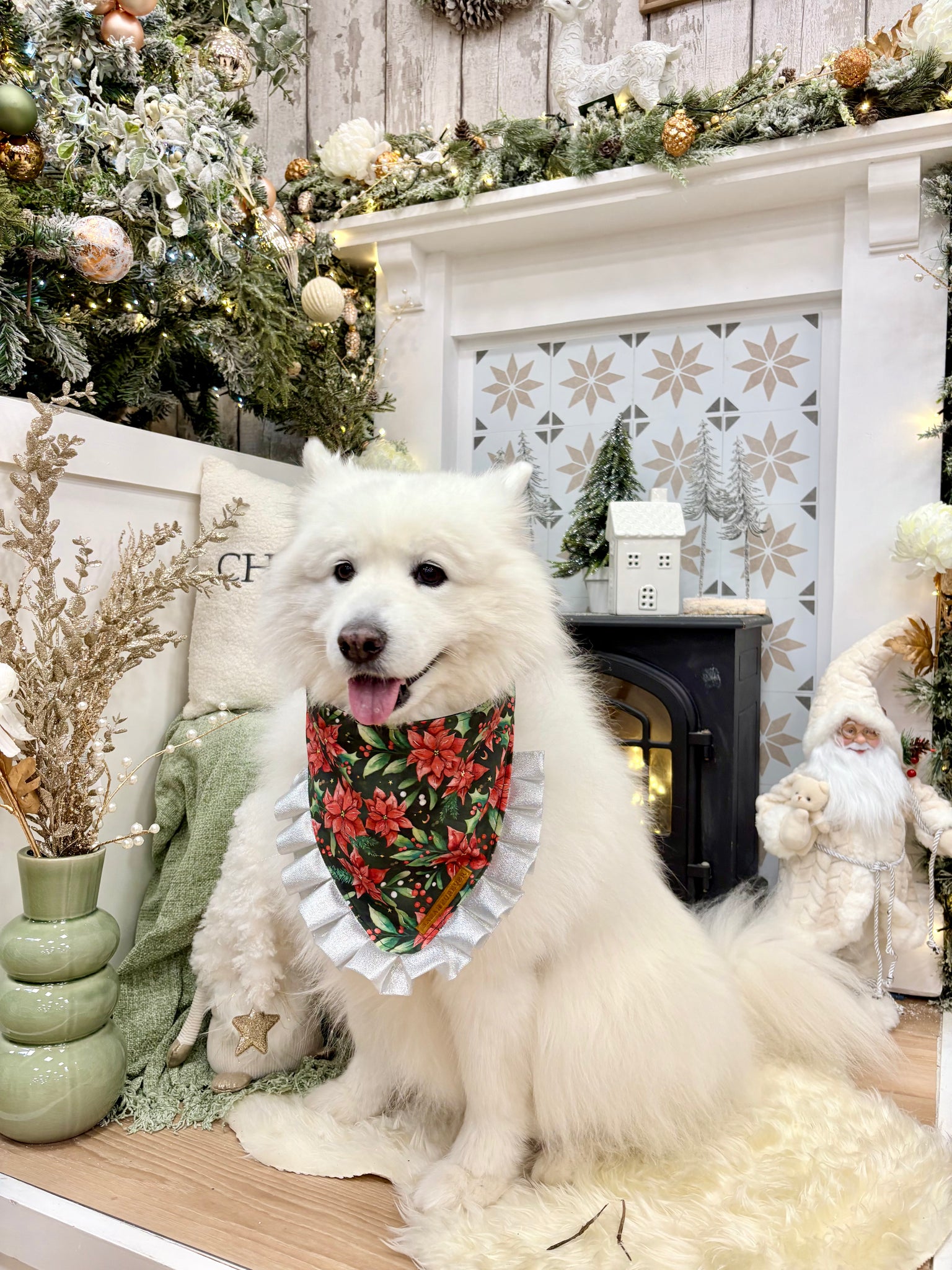 Christmas Poinsettia Dog Bandana with Silver Ruffles